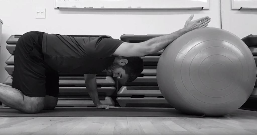 • Start on knees, right hand place on stability ball with thumb pointed towards the ceiling.