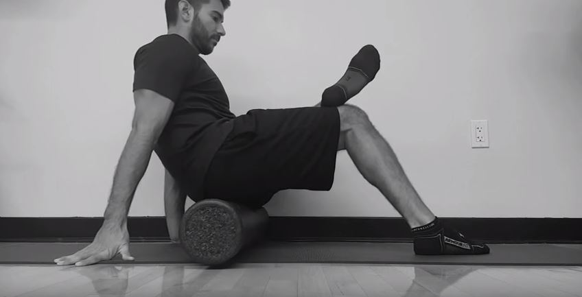 • Sit on Foam roller with right leg crossed, placing right ankle on left quadriceps.